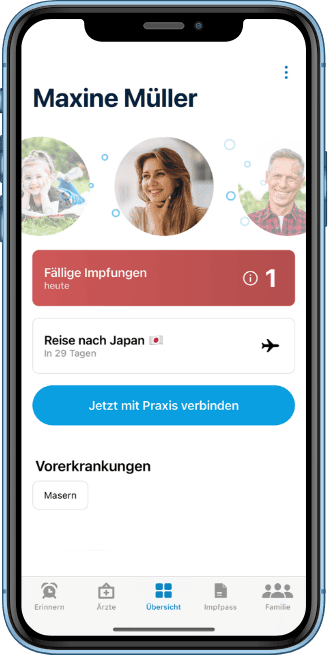 Du kannst Impfdaten für dich und deine gesamte Familie verwalten. Für jedes Familienmitglied kannst du individuelle Erinnerungen einrichten. So behältst du den Überblick über fällige Impfungen – vom Kleinkind bis zu den Großeltern.